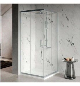 Il box doccia è composto da una anta scorrevole e una fissa, entrambe realizzate in cristallo trasparente temperato da 6 mm, che garantisce la massima resistenza e sicurezza durante l'utilizzo.