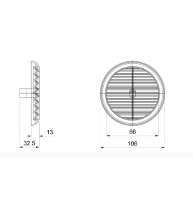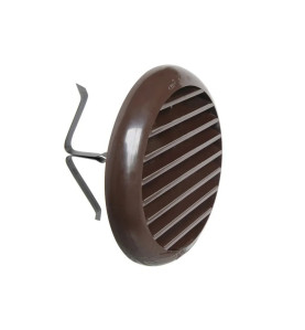 Griglia di ventilazione in plastica con molle, diametro esterno griglia 106 mm. Adatta per fori di ventilazione da 40 mm a 80 mm. Passaggio aria 40 cm². Completa di rete anti-insetto. Colore marrone.