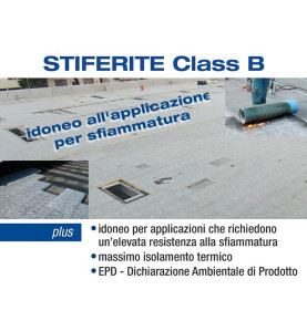 Isolante termico STIFERITE CLASS B in schiuma polyiso espansa rigida (PIR) a spessore, con rivestimenti di velo vetro bitumato accoppiato PP, idoneo alla sfiammatura, e velo vetro minerale saturato, avente: