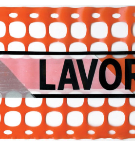 Rete arancio da cantiere estrusa in polietilene (HDPE) a maglia quadrangolare con bordo e fascia centrale rifrangente antistrappo.