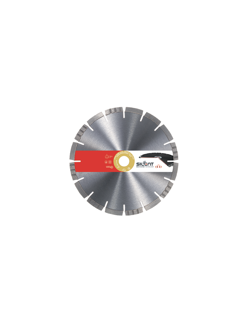 Disco diamantato con anima silenziata grazie alla tecnologia Silent che, attraverso l'inserimento di unostrato di materiale fonoassorbente tra due anime in acciaio, garantisce l'assorbimento delle vibrazioni, con la riduzione dei rumori ad alta frequenza durante il lavoro, preservando l’operatore dai rischi derivanti da una eccessiva esposizione ai rumori.